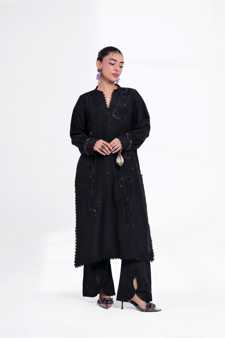 A timeless black outfit featuring delicate floral embroidery with subtle cutwork details on the trousers,...