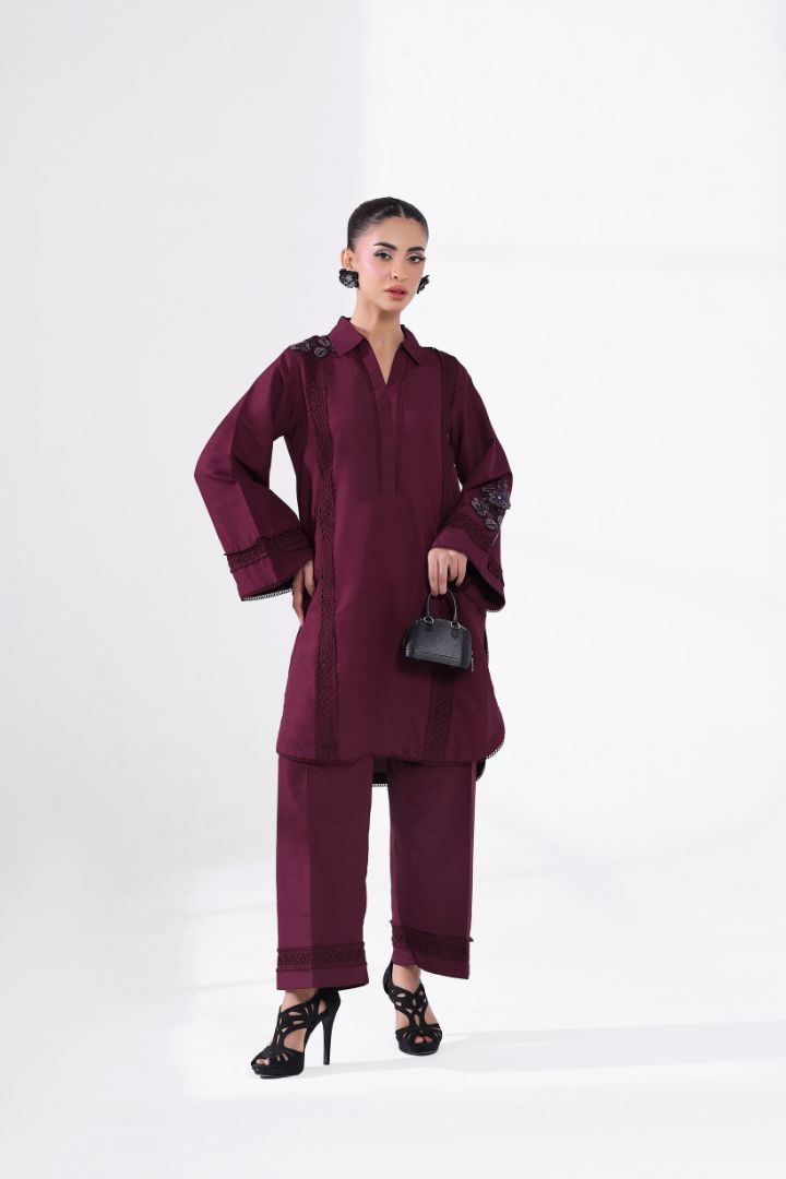 A stylish burgundy two-piece highlighted with black detailing and delicate hand-work, creating the perfect balance...